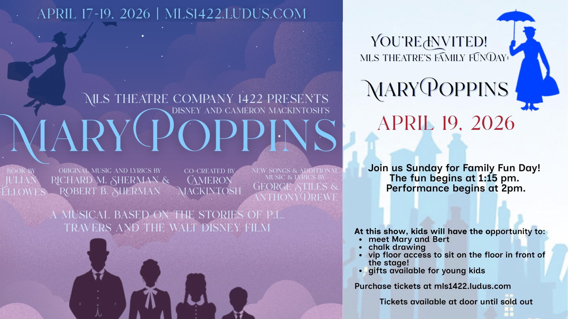 I’m thrilled to share that the MLS Theatre Company 1422’s spring musical, Mary Poppins, will take the stage this weekend! Audiences can look forward to a full lineup of special events, including Teacher Appreciation Night on Friday, Senior Night on Saturday, and a fun-filled Family Fun Day on Sunday.