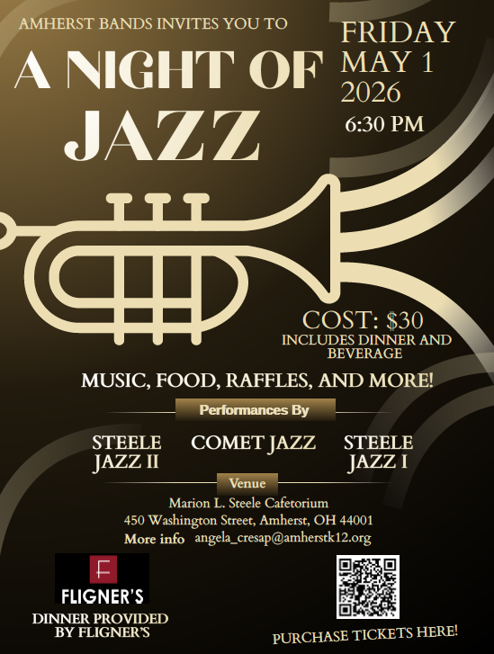 Join the Steele & AJH Jazz bands for a fantastic evening on Friday, May 1, 2026 at 6:30 PM in the Marion L. Steele Cafetorium!