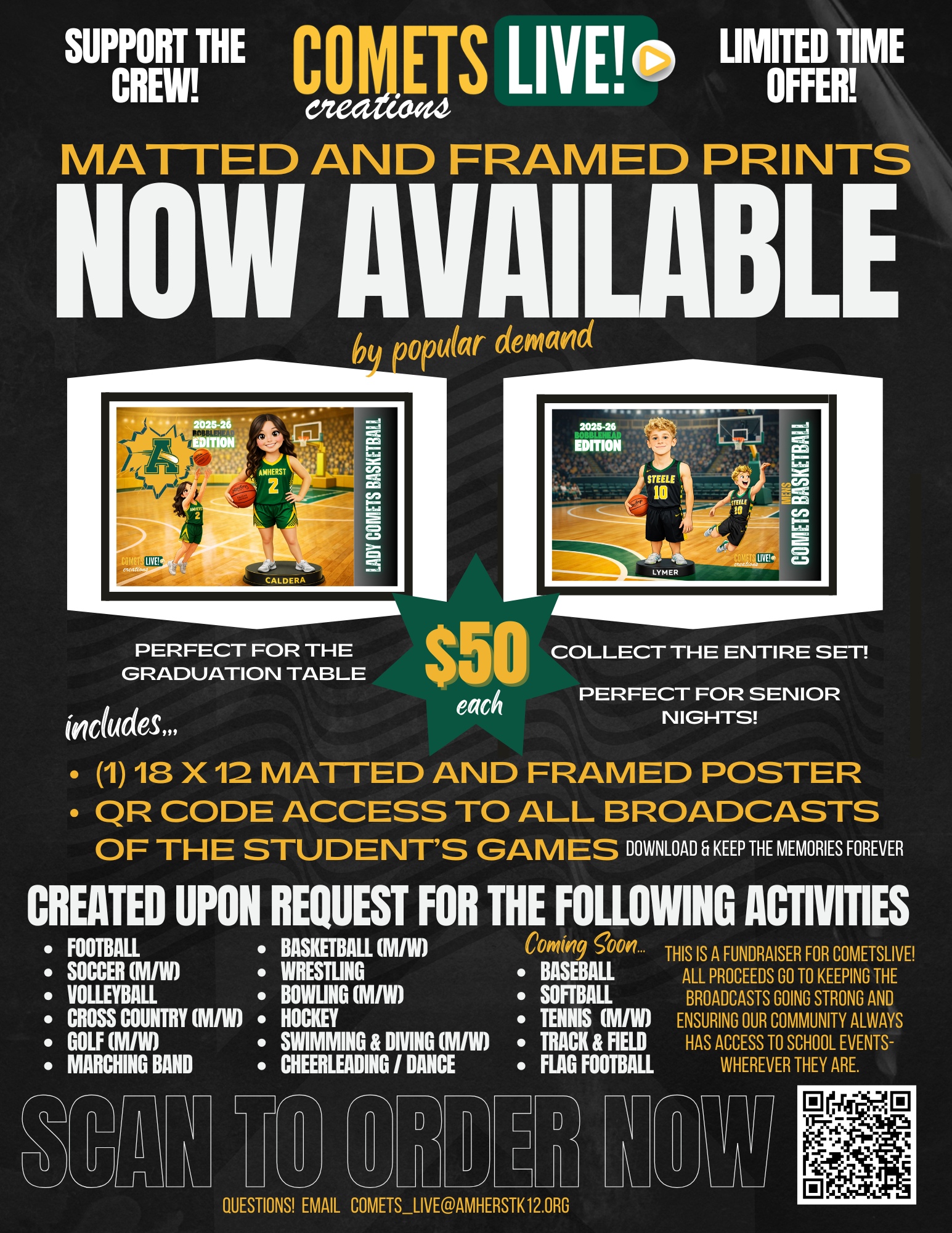 Support the COMETS LIVE! crew and celebrate your Comet with a custom 18x12 matted and framed print — just $50 each.