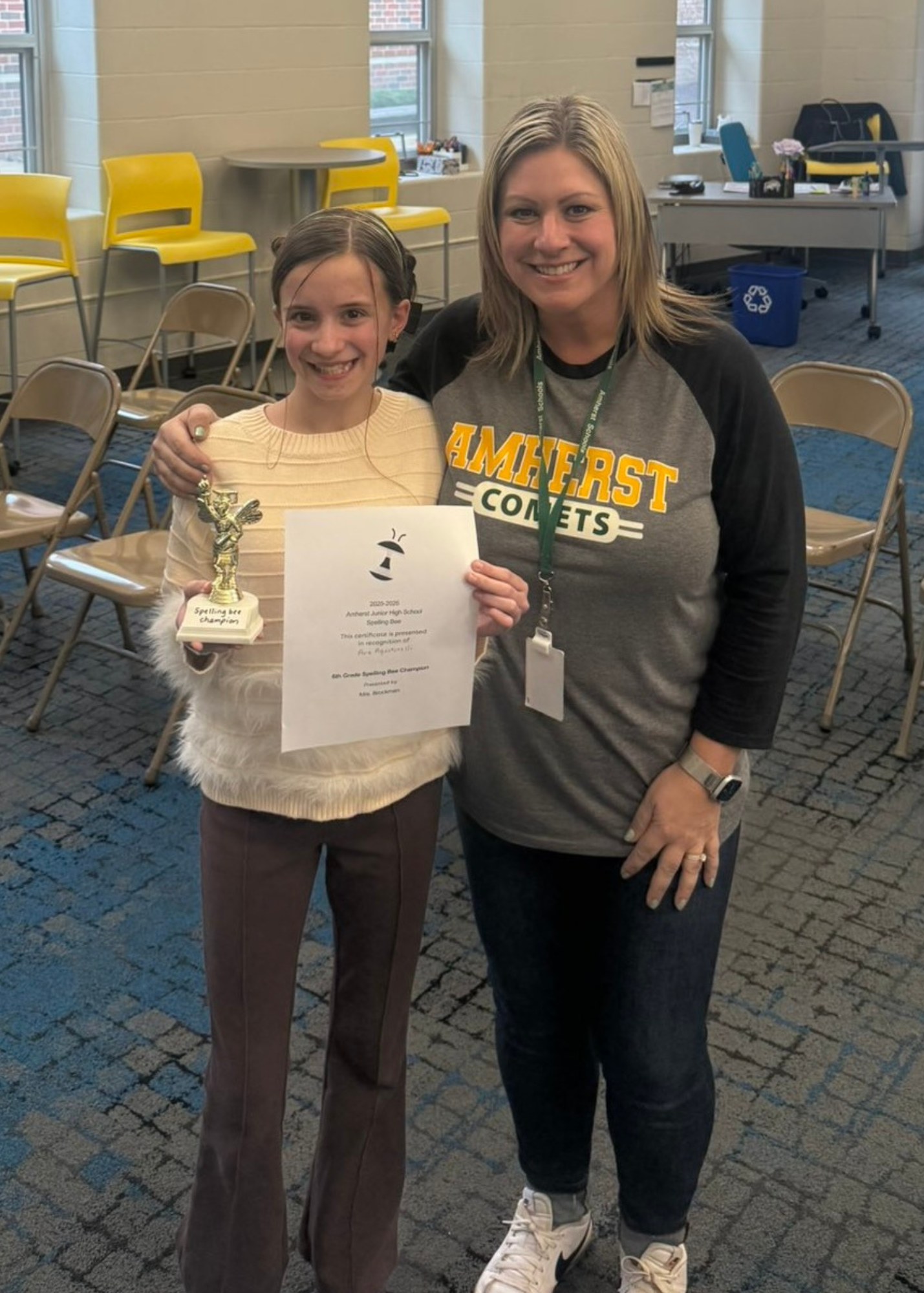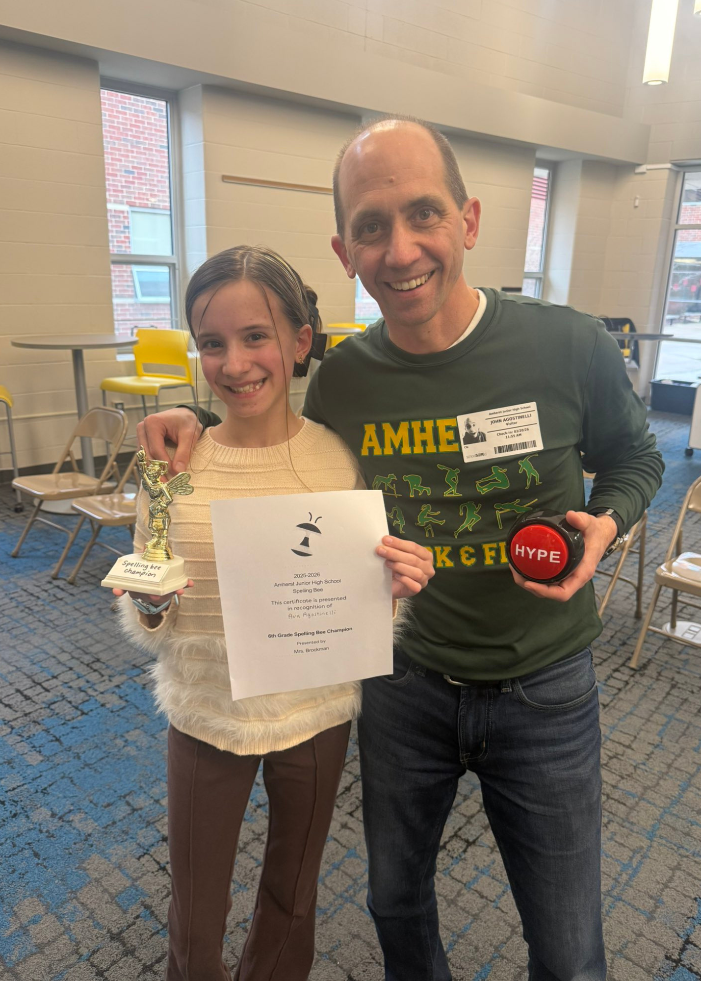 Ava secured her place by becoming the top speller in the Amherst Junior High 6th Grade Spelling Bee, which is an incredible accomplishment that reflects her hard work, dedication, and determination.