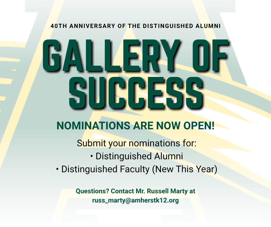 To be eligible for nomination in the Distinguished Faculty category, individuals must be retired and have taught in Amherst Schools. Faculty members who previously taught in Amherst and later retired from another district are also eligible.