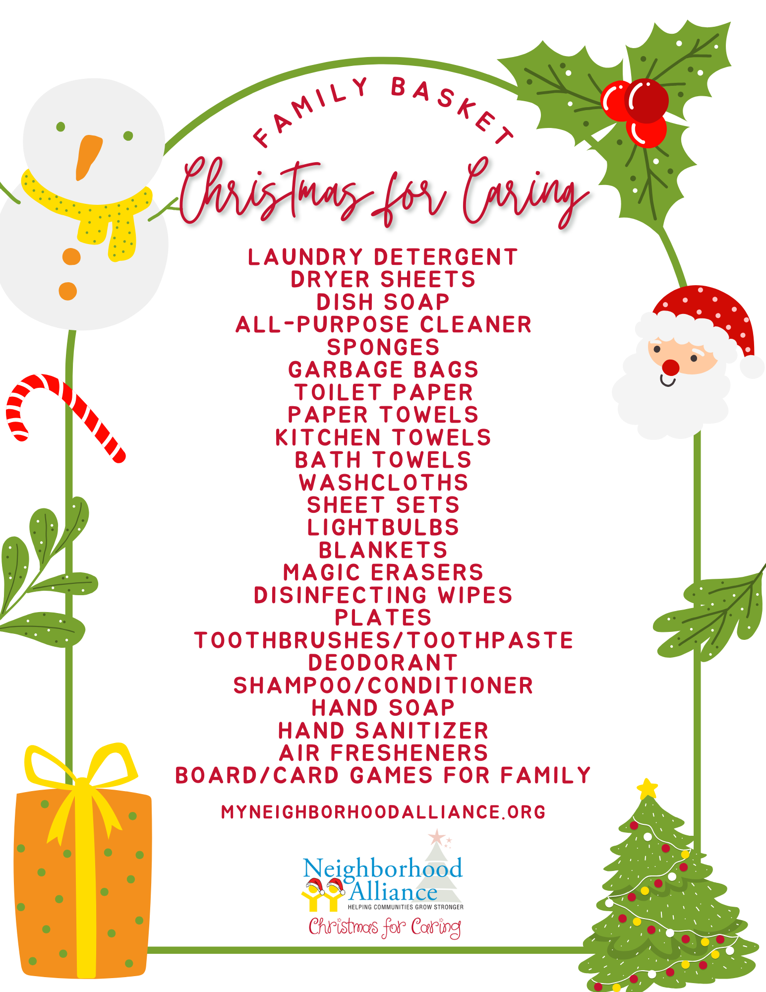 The Steele S.E.R.V.E. program is partnering with Neighborhood Alliance to help families in need this holiday season through their Christmas for Caring program. We will be collecting new items until November 25, and delivering baskets the week of December 1. Donations can be dropped off at Steele with Mrs. New or Mrs. Weaver in Room 405.