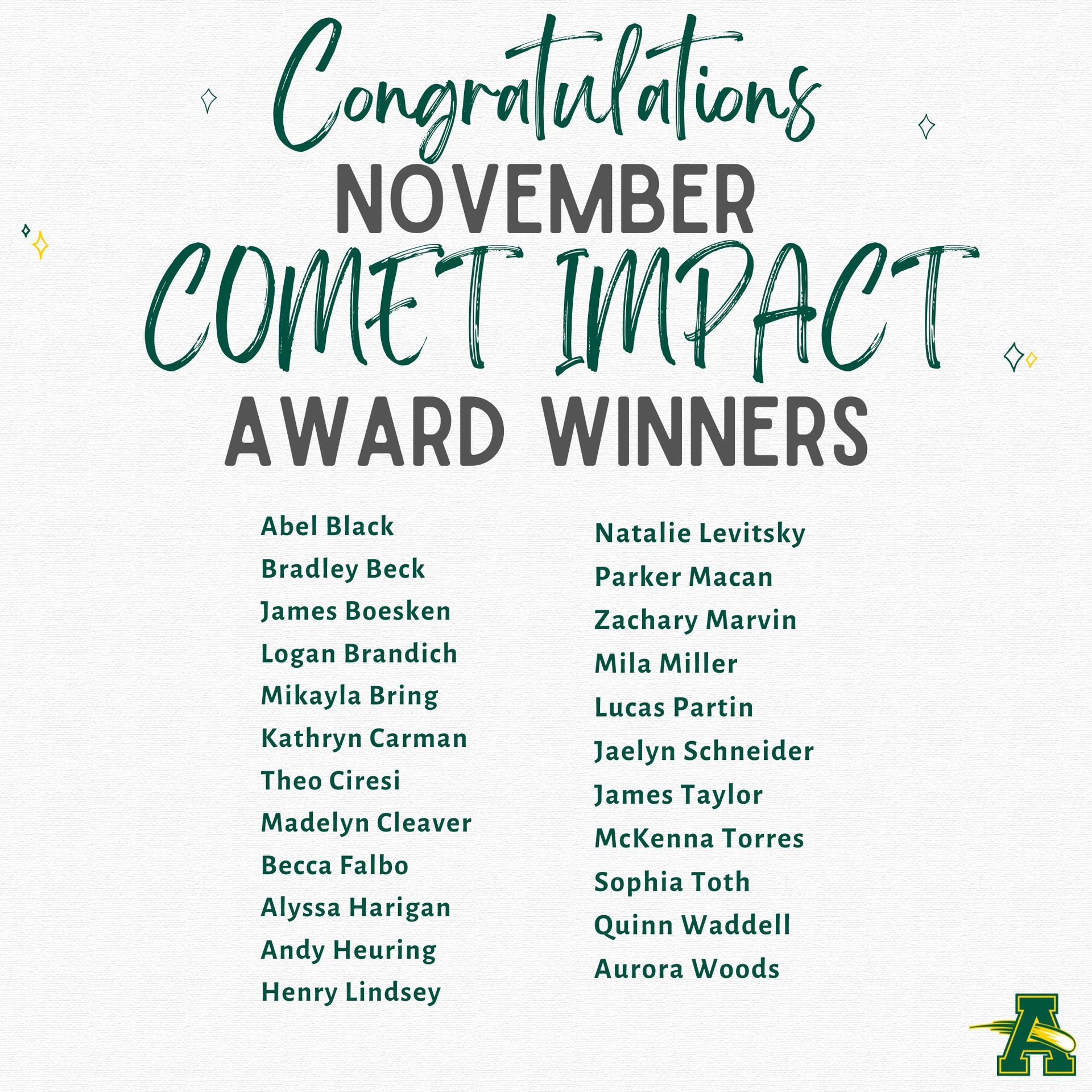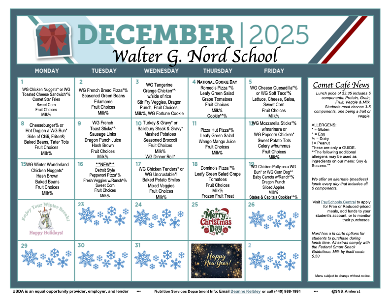 December is always an exciting time of year, and it’s no different at Walter G. Nord School. Our staff and students continue to work hard each day while making meaningful memories together. It’s hard to believe that in just a few short weeks we will reach the end of our first semester and the halfway point of the school year. We encourage you to stay in contact with your child’s teachers and reach out to the Nord Main Office at 440-988-4441 with any questions or concerns. A special congratulations goes out to our November Comet Impact Students of the Month, recognized below! Thank you for going above and beyond in demonstrating our Comet Impact expectations of being respectful, responsible, and safe.