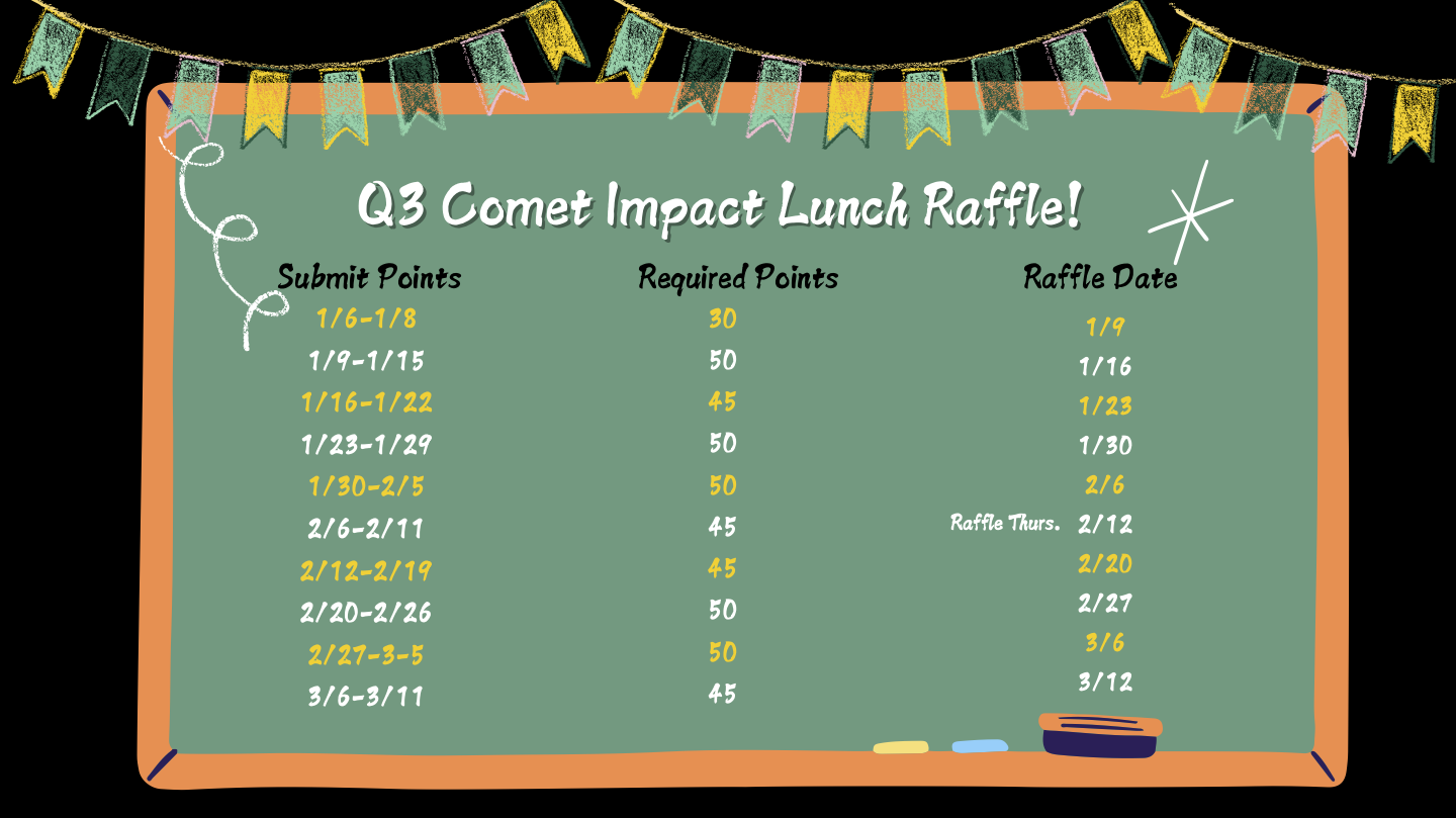 Congratulations to our first Comet Impact Raffle winners of 2026! Listed below are our required PBIS points for each week during the upcoming grading period. Students will continue to be recognized through our Comet Impact Friday raffles and can qualify for meeting our Nord expectations of respectful, responsible, and safe! |