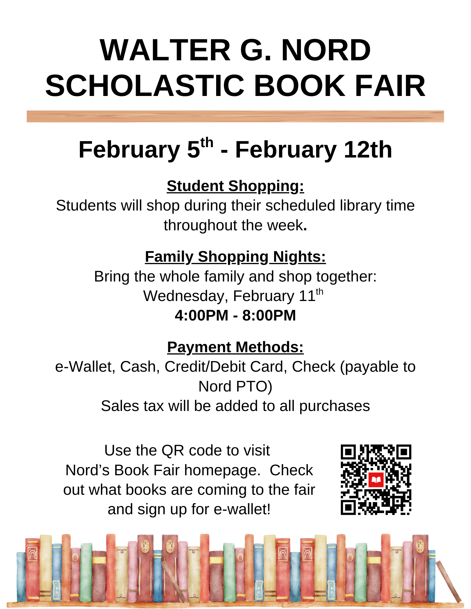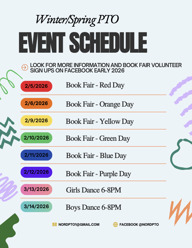 January 27th-January 29th: Steele Blood Cancer Fundraiser February 5th-February 12th: Nord PTO Book Fair Monday, February 9th: PTO Meeting, 9:30am Wednesday, February 11th: Parent Teacher Conferences, 3:35-8:35pm