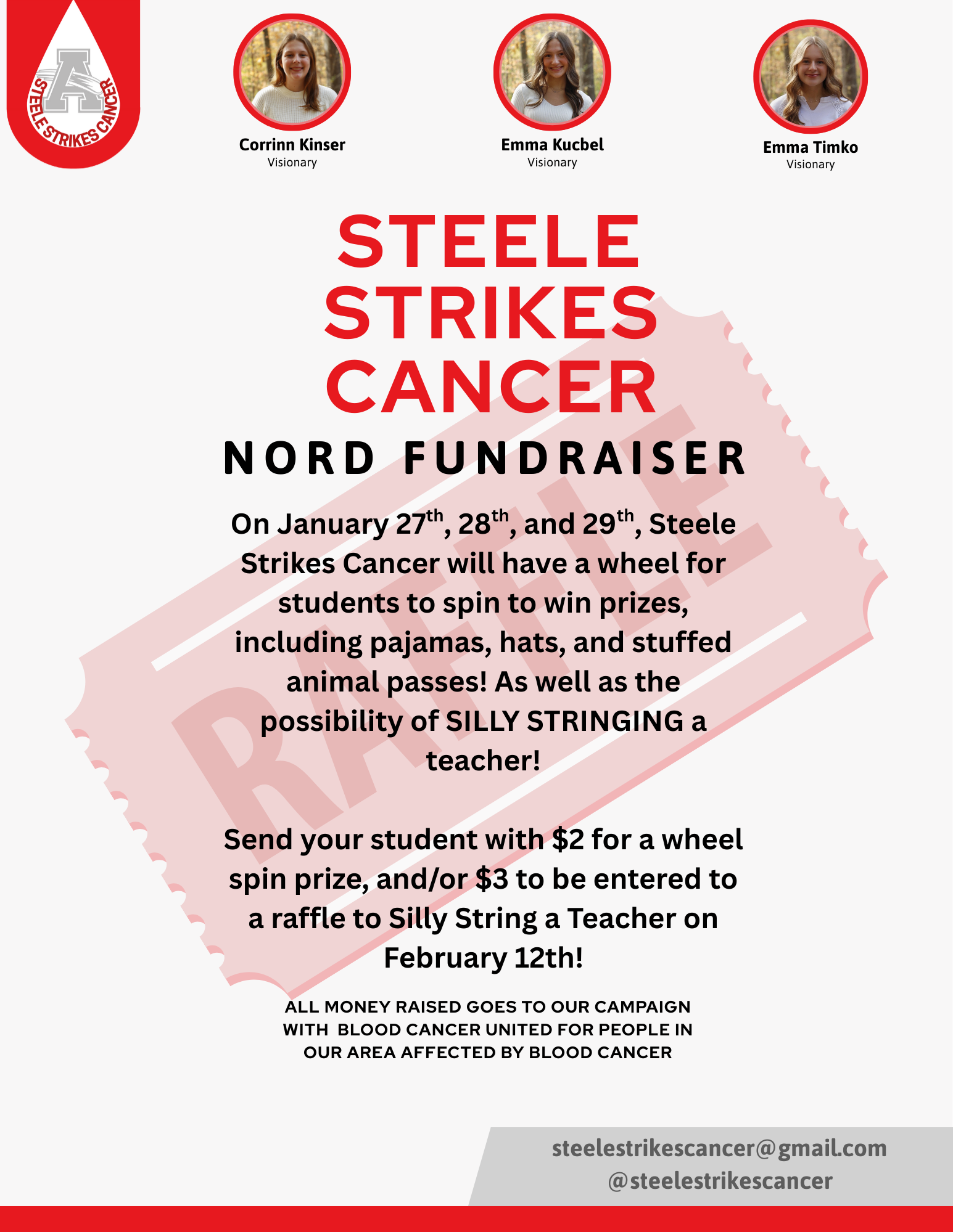 Later this month, The Marion L. Steele Blood Cancer Fundraising team of Corrinn Kinser, Emma Kucbel, and Emma Timko is bringing an exciting opportunity for our Nord students! Students will be able to spin the wheel to purchase PBIS passes and enter a raffle to silly string a teacher. All proceeds goes to the Marion L. Steele Strikes Cancer campaign. Please see the flyers below for more information. |