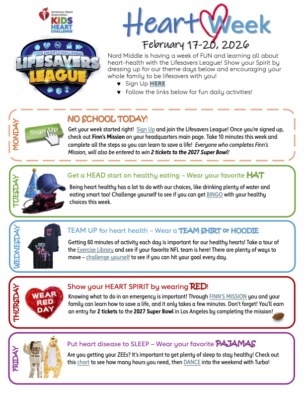 Walter G. Nord School will be hosting Valentine's Day Parties on Thursday, February 12th. Homeroom teachers will be sharing more information on times and parent chaperones in the upcoming weeks. Due to student privacy reasons, we will not be sending home lists with student names. Homeroom teachers will provide the number of students in your child's homeroom class. If you are sending in any food items, please make sure these are pre-packaged. Feel free to contact the Nord main office of your child's homeroom teacher with any questions.