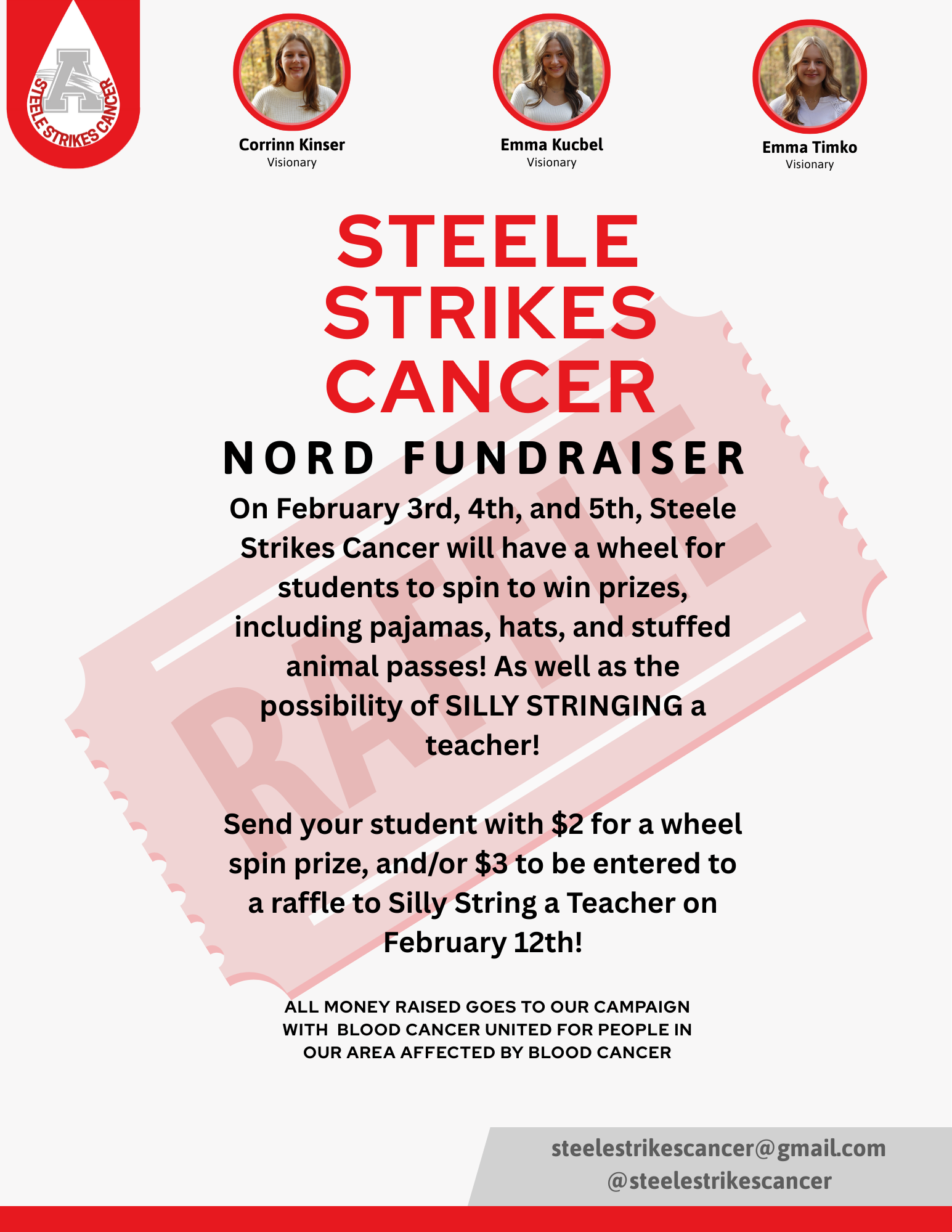 The Marion L. Steele Blood Cancer Fundraising team of Corrinn Kinser, Emma Kucbel, and Emma Timko is bringing an exciting opportunity for our Nord students! Students will be able to spin the wheel to purchase PBIS passes and enter a raffle to silly string a teacher. All proceeds goes to the Marion L. Steele Strikes Cancer campaign. Please see the flyers below for more information.