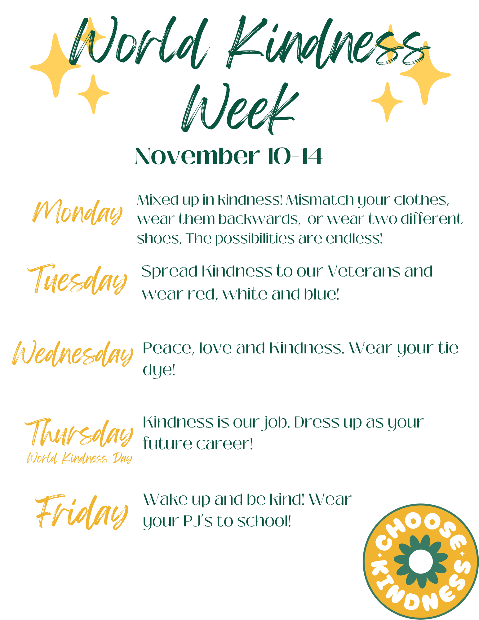 Next week will be an exciting one as we celebrate Nord Kindness Crew Spirit Week, which aligns with World Kindness Day on Thursday, November 13th. Please see the flyer below and encourage your child to join in the fun!