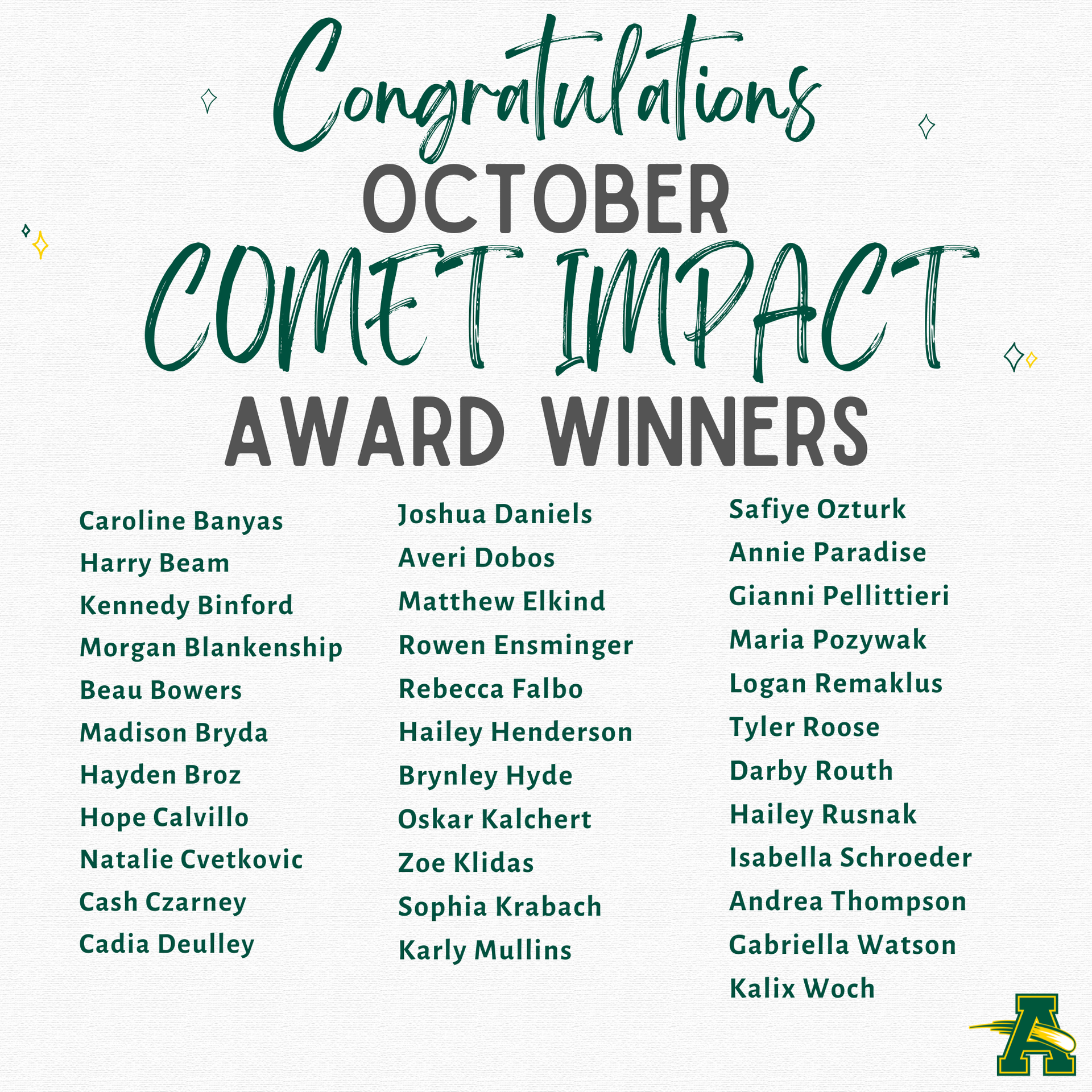 Congratulations to our Comet Impact students of the month for October! These students, listed below, were recognized by our staff for consistently demonstrating our Comet Impact respectful, responsible, and safe. Last week, our students used their first quarter PBIS points to purchase passes such as tech time, lunch with a teacher, stuffed animal passes, pajama passes, and hat passes! |