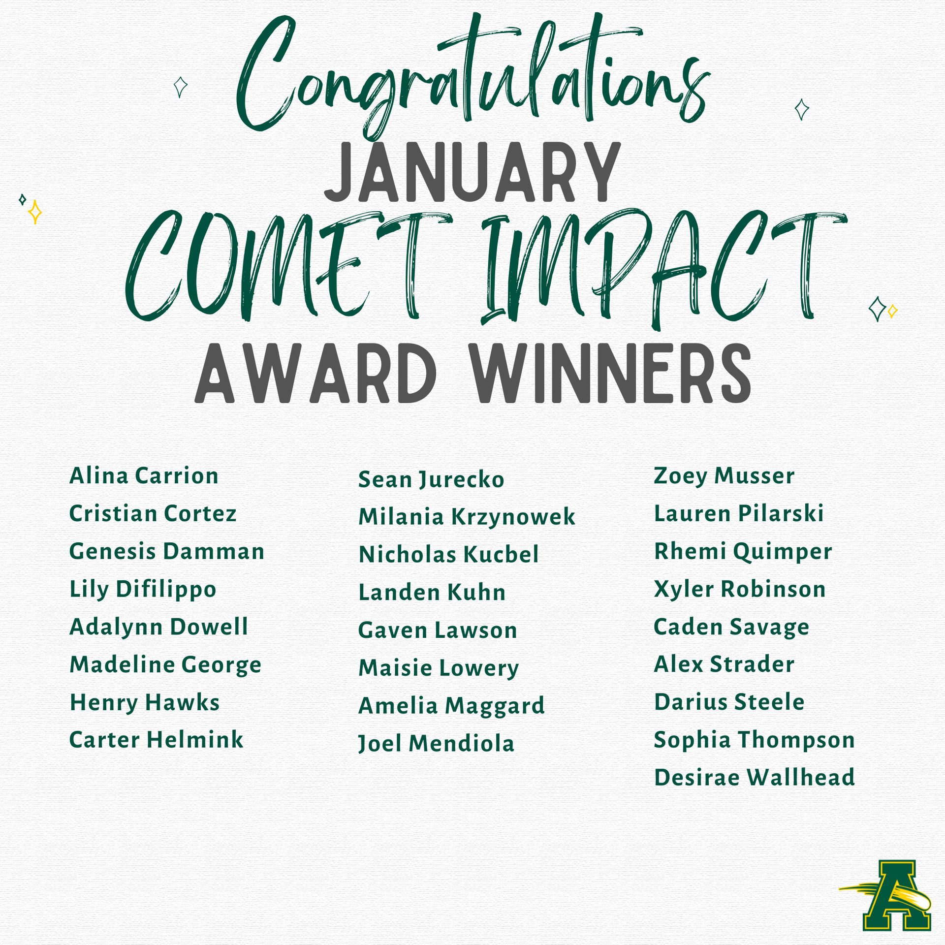 As a reminder, there is no school tomorrow, Friday, February 13th, or Monday, February 16th, in observance of Presidents’ Day. We hope everyone enjoys the long weekend! Congratulations to our Nord students listed below who were selected by our staff as January Comet Impact Students of the Month. Thank you for demonstrating what it means to be respectful, responsible, and safe each day at Nord!